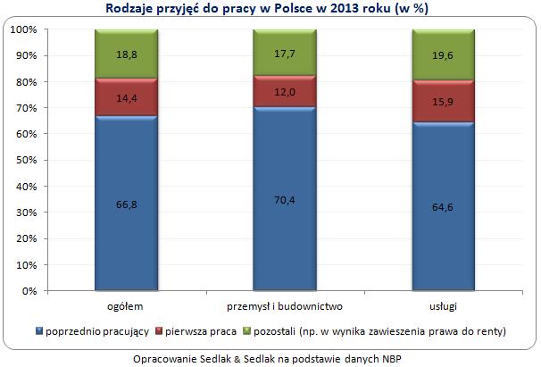 Jak wynika z raportu Narodowego Banku Polskiego, najczęstszym sposobem przyjęć do pracy w 2013 roku było przyjęcie osoby poprzednio pracującej. Zatrudnianie osób podejmujących pracę po raz pierwszy stanowiło zaś blisko 14,5% wszystkich przyjęć, przy czym sektor usług charakteryzował się wyższym udziałem tej formy przyjęcia do pracy.