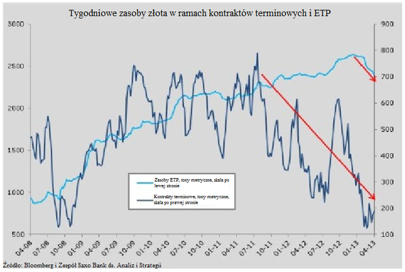 Redukcja o 65,5 tony z zeszłego tygodnia kontrastuje z zachowaniem funduszy hedgingowych, które w tygodniu zakończonym 16 kwietnia wykorzystały wyprzedaż, by stać się nabywcami netto. W ciągu ostatnich czterech tygodni z inwestycji wycofano ok. 113,7 ton złota, przez co zasoby zmalały do poziomów ostatnio notowanych w listopadzie 2011 r., kiedy cena złota była o prawie 300 USD wyższa niż w chwili obecnej.