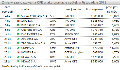 W listopadzie najbardziej aktywne były największe fundusze ING OFE (5 komunikatów) oraz Aviva OFE (3 komunikaty).