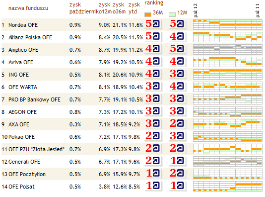 Październik przyniósł także poprawę oceny w 3-letnim horyzoncie dla Aegon OFE, który otrzymał ocenę 3a. W horyzoncie rocznym również otrzymał 3a. Jednostka funduszu zyskała od początku roku +10,1%. W krótkim horyzoncie (12 miesięcy) poprawę odnotował OFE Warta, który otrzymał ocenę 4a, przy zachowanej ocenie w horyzoncie 36-miesięcy na poziomie 4a.
