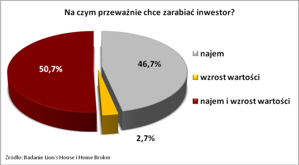 Dziś rentowność brutto najmu i oprocentowanie lokat są na podobnym poziomie. W sytuacji spadających stóp procentowych zakup mieszkań na wynajem może więc zyskiwać na popularności. Warto w tym miejscu zauważyć, że aż 97,3% inwestorów lokując pieniądze na rynku nieruchomości oczekuje przychodów z najmu. 46,7% badanych wskazało, że inwestorzy podejmują decyzję o zakupie mieszkania w oparciu o poziom potencjalnego przychodu z najmu. Niewiele więcej, bo 50,7% z nich bierze pod uwagę nie tylko rentowność, ale też potencjał nieruchomości do wzrostu wartości w horyzoncie inwestycyjnym. Należy podkreślić, że ten na rynku mieszkaniowym powinien przeważnie zakładać lokatę kapitału przynajmniej na kilka lat. Powodem są między innymi koszty transakcyjne. Te wynoszą przy zakupie mieszkania często 5 – 7%, czyli tyle ile w ciągu roku może dostać właściciel od najemcy. Nie bez kozery więc jedynie 2,7% inwestorów chce zarabiać jedynie na wzroście wartości nieruchomości. Pozytywne zmiany w tym zakresie w 2013 roku są mało prawdopodobne.