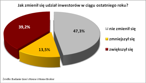 7,3% osób, które w bieżącym roku kupiły mieszkania, zrobiły to w celach inwestycyjnych – wynika z badania przeprowadzonego wśród doradców Home Broker i Lions House. Czy jest to więcej czy mniej niż przed rokiem? Zdania są w tym względzie podzielone. Spora grupa (47,3%) badanych uznała, że w tym zakresie nie doszło do zmian. Nie można jednak lekceważyć niewiele mniejszej grupy (39,2%) ankietowanych, w których opinii aktywność inwestorów jest w bieżącym roku wyższa niż w 2011. Przeciwnego zdania jest tylko 13,5% osób. Spora przewaga osób twierdzących, że dziś na rynku inwestorów jest więcej niż przed rokiem nad tymi o przeciwnym zdaniu, znajduje swoje uzasadnienie w danych rynkowych. Powodem może być bowiem spora obniżka stawek za zakup mieszkań (kilkanaście procent r/r) i tylko niewielka korekta cen najmu (kilka procent r/r).