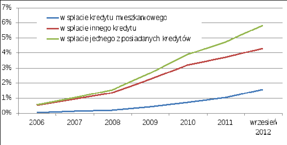 Z kolei wśród spłacających kredyty mieszkaniowe w złotych, na koniec 2008 roku, problem miało ok. 3 proc. klientów. Dwa lata później ich odsetek doszedł do 7 proc. Na koniec września 2012 roku, z co najmniej jednym rachunkiem kredytowym obsługiwanym z powyżej 90-dniowym opóźnieniem było 21,1 tys. osób, czyli 8,24 proc.