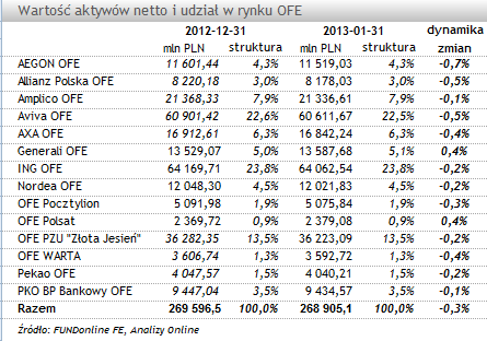 W styczniu, po raz pierwszy od siedmiu miesięcy, aktywa zgromadzone w otwartych funduszach emerytalnych straciły na wartości. Zmiana wartości aktywów netto wyniosła -691 mln zł, co oznacza spadek o -0,3% w stosunku do stanu z końca grudnia 2012 r. Na koniec stycznia fundusze emerytalne zarządzały aktywami wartymi 268,9 mld zł. To o +15,3% więcej niż rok wcześniej.