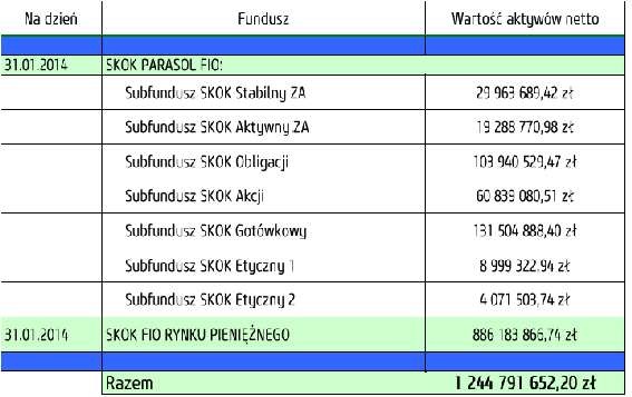 Pragniemy poinformować, iż wartość aktywów netto zarządzanych przez TFI SKOK S.A na dzień 31 stycznia 2014 r. wyniosła 1 244 791 652, 20 zł. Na powyższą wartość składa się wartość aktywów netto dla poszczególnych funduszy/ subfunduszy: