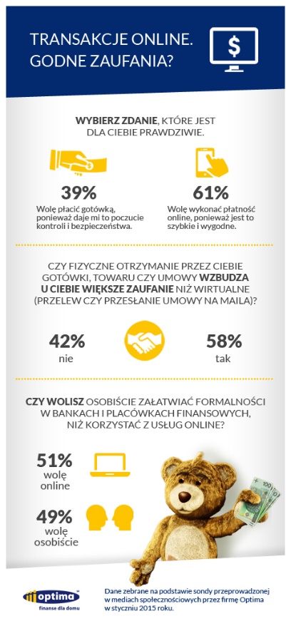 Z sondy internetowej przeprowadzonej przez firmę Optima na początku 2015 roku wynika, że 22% Polaków nie korzysta z wirtualnego konta bankowego, a 25% z nich ma obawy związane z korzystaniem z sieci w celach finansowych. Najbardziej obawiamy się kradzieży haseł (20%)oraz skomplikowanych procedur i błędów systemowych (16%). Aż 39% osób czuje się bezpieczniej, kiedy płaci gotówką. Dodatkowo 58% ankietowanych czuje się pewniej, otrzymując gotówkę i umowę fizycznie, a 49% woli załatwiać formalności finansowe osobiście.