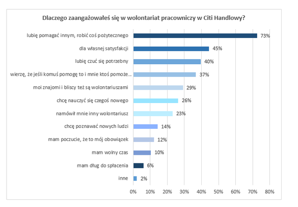 przebadanych osób po raz pierwszy zetknęło się z tego typu pracą dzięki programowi wolontariatu pracowniczego w Citi Handlowy. Uczestników pytano również o powody, dla których angażują się w tę formę pomocy – 73 proc. mówi, że kierowała nimi chęć pomagania innym i robienia czegoś pożytecznego, 45 proc. wskazało poczucie satysfakcji, będącą główną przyczyną zaangażowania w wolontariat. Trzecim najczęściej wymienianym czynnikiem było poczucie bycia potrzebnym (40 proc.). Zdaniem 94 proc. ankietowanych wolontariat pracowniczy pozytywnie wpływa na postrzeganie Citi Handlowy jako ich pracodawcy.