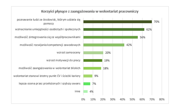 Co ważne wolontariusze biorący udział w badaniu potrafili także wskazać korzyści, które czerpią dzięki zaangażowaniu w wolontariat – 70 proc. ankietowanych uważa za najważniejszą z nich jest poznawanie ludzi ze środowisk, którym udziela się pomocy. Drugą, wybraną przez 62 proc. respondentów, zaletą zaangażowania w tego typu prace jest wzmocnienie umiejętności osobistych i społecznych.
