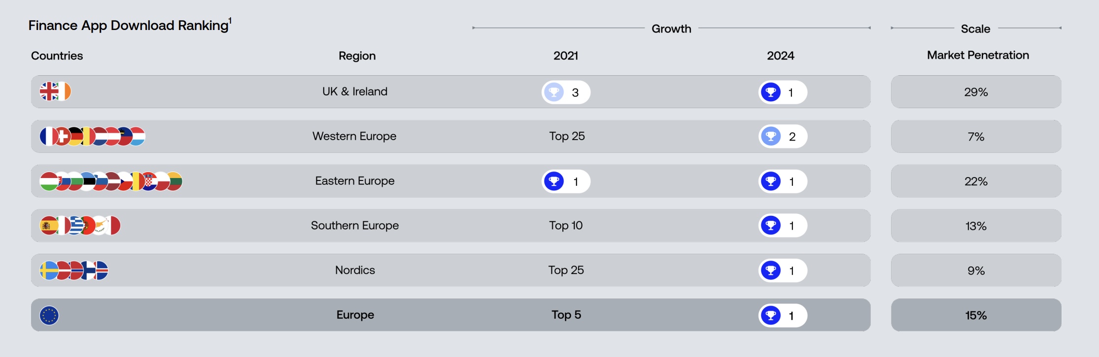 Rynkowe przywództwo i zasięg: Dynamika wzrostu była wysoka w całej Europie. Revolut stał się najczęściej pobieraną aplikacją w kategorii finanse w 19 krajach (1 miejsce), z kolei w 26 krajach w Europie uplasował się w TOP3.