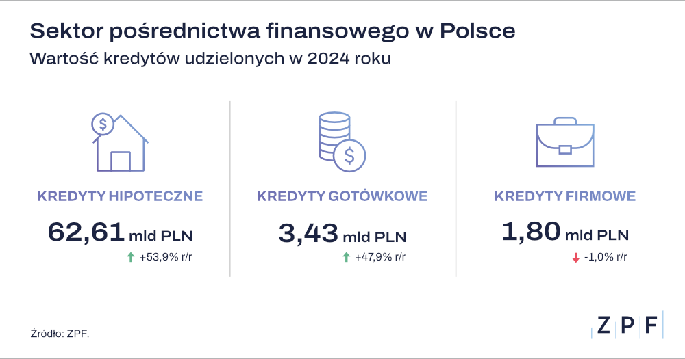 Firmy z sektora pośrednictwa finansowego w Polsce, które są zrzeszone w ZPF, opublikowały dane za 2024 r. Dotyczą one sprzedaży kredytów hipotecznych, gotówkowych, firmowych, a także produktów oszczędnościowych.