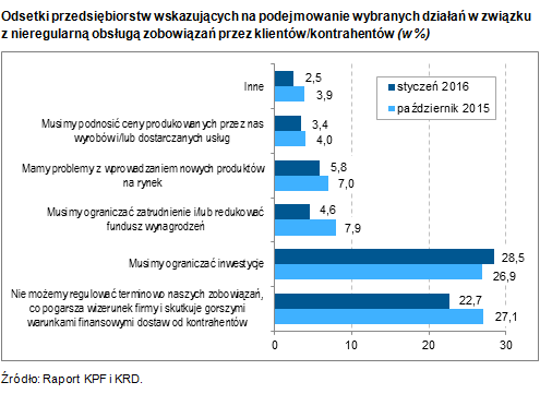 W konsekwencji niskich standardów etyki zobowiązań w praktyce gospodarczej w Polsce, częściej niż co czwarty przedsiębiorca nie jest w stanie wywiązywać się w terminie ze swoich zobowiązań. I choć ten skutek w postaci nieotrzymywania zapłaty w terminie w poprzednich badaniach był najczęściej wskazywanym problemem wynikającym z opóźnień w spływie należności i aktualnie znaczenie tej bariery bardzo znacząco spada, to nadal jest to drugi skutek co do siły negatywnego wpływu. Wzrosło natomiast znaczenie negatywnego wpływu opóźnień na realizację inwestycji. Te zaś dla mają przecież ogromne znaczenie dla budowania przewagi konkurencyjnej, czy choćby zachowania udziału w rynku, a w efekcie – wpływ na intensyfikację wzrostu gospodarczego kraju. W najnowszym badaniu 28,5% firm deklaruje, że występujące opóźnienia przekładają się negatywnie na możliwość realizowania projektów inwestycyjnych. Nadto, 4,6% firm deklaruje, że w efekcie opóźnień w realizacji należności musi ograniczyć zatrudnienie.