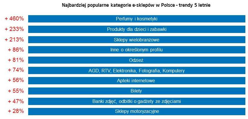 Mimo że odzież jest najczęściej wybieraną kategorią wśród internautów kupujących w sieci (28 proc.) to przez ostatnie 5 lat największy wzrost popularności odnotowała kategoria Perfumy i kosmetyki (460 proc.) Jest to podyktowane faktem, że dopiero od niedawna sieci drogeryjne i kosmetyczne są obecne w kanale online. Rosnącym zainteresowaniem cieszą się również sklepy wielobranżowe oraz oferujące produkty dla dzieci i zabawki.