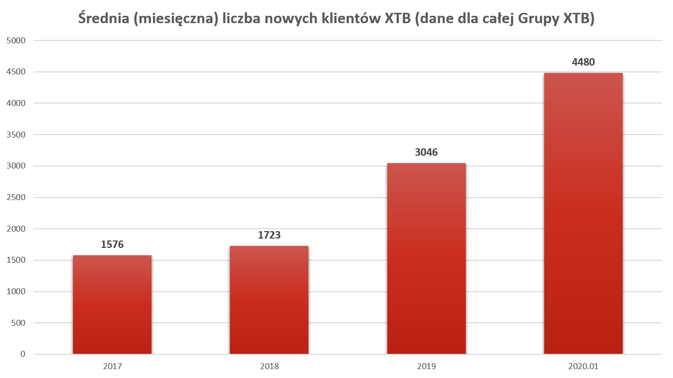 Tylko w grudniu 2019 roku liczba nowych klientów wyniosła 2954 (szacunki dla całej Grupy XTB). Styczeń okazał się rekordowy nie tylko w porównaniu z poprzednimi miesiącami, ale jest to także historycznie najlepszy miesiąc pod względem liczby nowych klientów od początku istnienia firmy.