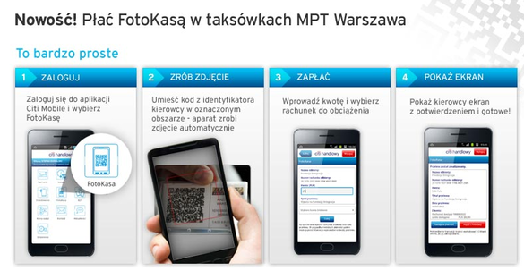 To już druga edycja promocji FotoKasy. Podobnie jak w zeszłym roku tak i teraz użytkownicy Citi Mobile mogą obniżyć swoje rachunki za wybrane usługi (UPC Polska Sp. z o.o., Netia S.A., Telekomunikacja Polska S.A., PGNiG S.A., PTK Centertel Sp. z o.o.) do 10% (maksymalnie 20 zł za każdy rachunek) oraz otrzymać jednorazowy zwrot maksymalnie 20 zł za dokonanie pierwszej płatności FotoKasą za przejazd taksówką MPT Warszawa. Wystarczy tylko, że płatności te uregulują za pomocą FotoKasy.