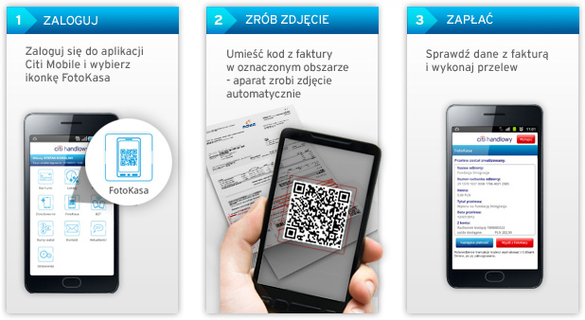 FotoKasa to innowacja w ramach aplikacji Citi Mobile. Oparta o natywną funkcję smartfonu – aparat cyfrowy – pozwala na skanowanie fotokodów na dokumentach papierowych lub elektronicznych, by potem umożliwić klientom szybką i wygodną realizację płatności przez Citi Mobile.