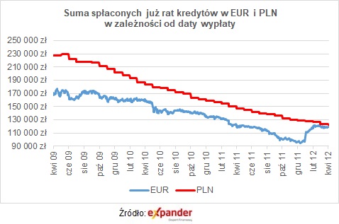 Część frankowiczów, gdyby mogło cofnąć czas, to pewnie wybrałoby kredyt w złotych. Zupełnie inaczej wygląda sytuacja tych, którzy zaciągnęli kredyt w euro. Z wyliczeń Expandera wynika, że suma zapłaconych dotychczas rat jest u nich od 3 000 zł nawet 61 000 zł niższa niż w przypadku, gdyby spłacali kredyt w polskiej walucie. W przypadku kredytów we frankach sytuacja jest bardziej skomplikowana. Nieco ponad połowa straciła na swoim kredycie, a niecała połowa na nim zyskała. Niestety tych, którzy tracą przybywa z każdym miesiącem, ponieważ raty kredytów w CHF są wyższe niż w PLN, we wszystkich badanych przez nas przypadkach.