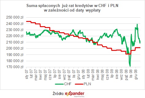 W najgorzej sytuacji są ci, którzy zaciągnęli taki kredyt 11 grudnia 2008 r. Oni zapłacili już o 38 063 zł więc niż ci, którzy wybrali kredyt w złotych. Przyczyną tego jest wysoka marża (3,45%) i dość niski kurs w dniu wypłaty (2,44 zł). Dla porównania, ci którzy kredyt zaciągnęli w pierwszych dniach sierpnia 2008 r., kiedy kurs spadł poniżej 2 zł, zapłacili o ok. 33 000 zł więcej niż w kredycie w PLN. Najwięcej na kredycie we frankach zyskali natomiast ci, którzy zadłużyli się 5 marca 2007 r. Oni zapłacili o 22 608 zł mniej niż wynosi suma rat kredytu w PLN.