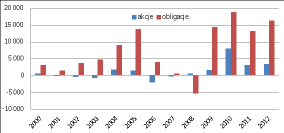Choć kapitał zagraniczny, lokowany w polskie akcje stanowi zaledwie około jednej piątej tego, co trafia na rynek papierów dłużnych (wyjątkowy był rok 2010, gdy saldo kupna i sprzedaży akcji stanowiło aż 40 proc. salda dla obligacji), proporcje te są zdecydowanie korzystniejsze dla akcji niż w latach 2002-2006. Popularność polskich akcji wyraźnie się zwiększa, korzystając częściowo z hossy na rynku papierów dłużnych. Niewykluczone, że giełda skorzysta jeszcze bardziej z prawdopodobnego przemieszczania się kapitału z charakteryzujących się bardzo niską rentownością obligacji w kierunku zyskujących na atrakcyjności i mających coraz lepsze perspektywy akcji.