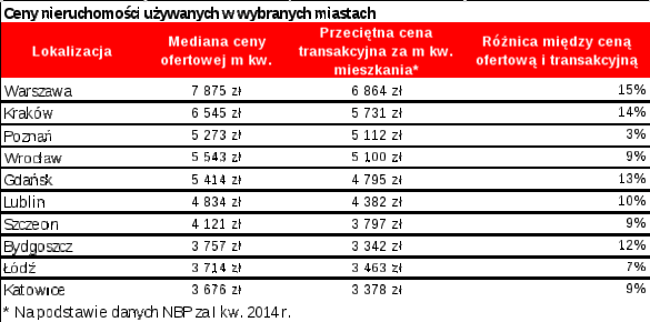 Warto zauważyć, że przedstawione mediany cen ofertowych są wyraźnie wyższe od przeciętnych transakcyjnych, które ostatnio za czwarty kwartał opublikował NBP. Różnice wynoszą od 3% w Poznaniu do 15% w Warszawie. Przeciętnie aż o 10% mediana cen ofertowych przewyższa średnią cenę transakcyjną. Faktycznie nabywane nieruchomości na rynku są więc przeważnie wyraźnie tańsze niż te, które właściciele oferują do sprzedaży.