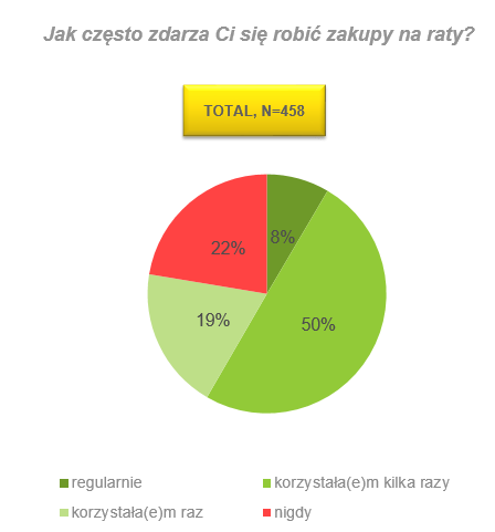 Jak pokazują wyniki badania zrealizowanego na zlecenie firmy Lindorff SA, zakupy na raty nie są nam obce. Trzech na czterech Polaków korzystało lub korzysta z tej formy pomocy przy zakupach potrzebnych artykułów. Aż połowa ankietowanych brała tego rodzaju zobowiązanie kilka razy w swoim życiu. Niemal co piaty badany (19%) zaciągał je przynajmniej raz. A 8% respondentów przyznało, że regularnie korzysta z takiej możliwości finansowania swoich zakupów, traktując je po prostu jako zwyczajowy sposób realizacji droższych wydatków. Zachowawczo podchodzi do niej natomiast 22% ankietowanych, którzy jeszcze nigdy z nich nie korzystali.