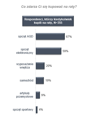 Zdecydowanym liderem w kategorii zakupów na raty jest sprzęt AGD – wskazało go 67% badanych. Na drugim miejscu znalazł się sprzęt elektroniczny (59%). Dzięki zakupom na raty kupujemy meble i wyposażamy także wnętrza naszych domów czy mieszkań – taką odpowiedź wskazał co piąty ankietowany. Niemal tyle samo osób kupuje w ten sposób samochód (19%).