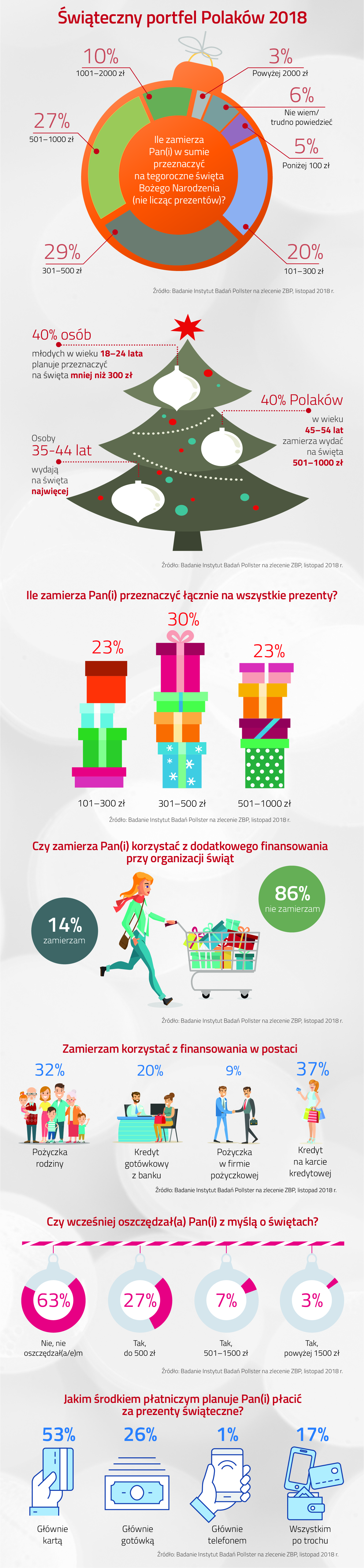 Okres świąteczno-noworoczny to jeden z najbardziej wymagających finansowo momentów w roku. Pomimo tego, aż 63% Polaków deklaruje, że nie oszczędza z wyprzedzeniem na ten cel. Jednocześnie, jak wynika z raportu „Świąteczny portfel Polaków 2018”, przygotowanego przez Związek Banków Polskich (ZBP), aż 54% badanych nie zamierza przeznaczyć na świąteczne wydatki więcej niż 500 zł, a podobną kwotę dodatkowo pochłonie zakup prezentów dla najbliższych. Jedynie 14% Polaków deklaruje, że przy okazji świąt skorzysta z dodatkowego finansowania, z drugiej strony bankowcy wskazują, że kwota kredytu gotówkowego udzielanego przed świętami najczęściej przekracza 4000 zł.