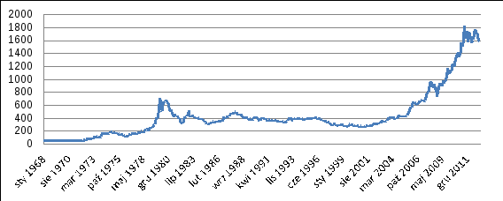 Okresy względnej stabilizacji notowań nie są więc na tym rynku niczym wyjątkowym (jeszcze wcześniej trend boczny trwał od 1993 do1996 r.). Można raczej powiedzieć, że silne i długotrwałe fale wzrostowe, takie jak ta z lat 2001-2011, nie należą do zjawisk powszechnych. Poprzednia taka fala miała miejsce od 1970 do 1980 r. Najdłuższy trend boczny trwał 16 lat, od 1982 do 1998 r. Zakres wahań w jego ramach wynosił nieco ponad 30 proc. (jedynie sporadycznie zdarzały się wyskoki sięgające 40-50 proc.). W ciągu ostatnich 45 lat 20 lat stanowiły okresy hossy, 20 lat to dłuższe okresy stabilizacji, a jedynie 5 lat notowania spędziły w silnych trendach spadkowych (w trakcie trzech największych fal spadków ceny spadały dwukrotnie po około 40 proc. i raz o niemal 70 proc.).