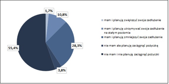 Aż 55,4% gospodarstw domowych nie planuje w najbliższym czasie zaciągać zobowiązań gotówkowych w ogóle, podczas gdy 28,3% zmniejszy swoje zadłużenie, 10,8% je utrzyma, a 5,5% gospodarstw domowych deklaruje, że nawet je zwiększy. Od 2007 roku widać stałą tendencję wśród gospodarstw domowych do ograniczania zainteresowania wzrostem zadłużania się w „gotówce”. Najprawdopodobniej jest to spowodowane między innymi wzrostem przeciętnej płacy, ale także powstaniem alternatywy w postaci innych produktów bankowych. Najbardziej stabilny jest odsetek tych gospodarstw domowych, które planują utrzymać swoje zadłużenie na tym dotychczasowym poziomie, dla których kredyt czy pożyczka gotówkowa może być sposobem na utrzymanie płynności finansowej.