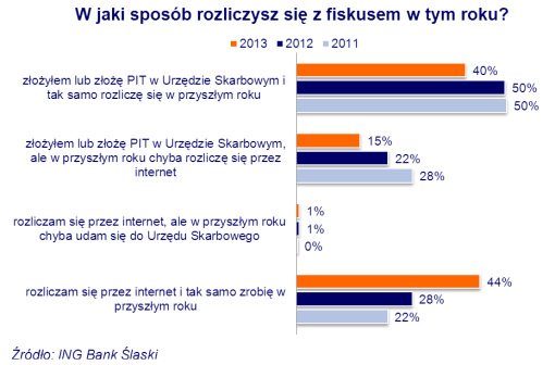 Pytanie o popularność e-pitów ING zadaje co roku. W 2011 i 2012 r. połowa podatników biorących udział w ankietach banku nie była w ogóle zainteresowana rozliczeniem się z urzędem skarbowym przez internet. Tymczasem w tegorocznej sondzie okazało się, że takich osób jest już o 10% mniej. W dwa lata odsetek podatników przekonanych do e-PIT-ów wzrósł dwukrotnie – z 22% w 2011 r. do 45% w 2013 r.