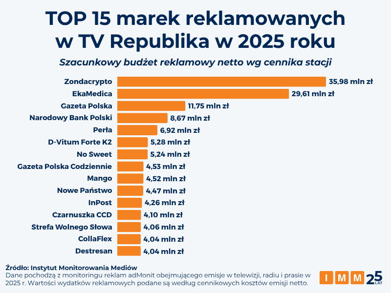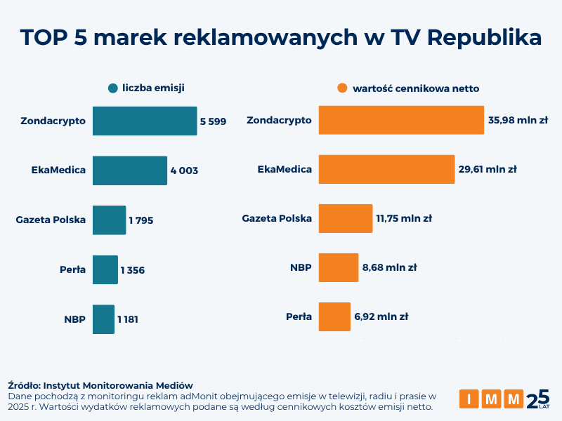 Pięć największych marek reklamujących się w TV Republika w 2025 roku zakupiło łącznie emisje 13934 spotów o wartości cennikowej 92,9 mln zł netto. Liderem była marka Zondacrypto z kampaniami o wartości szacowanej na blisko 36 mln zł netto, których emisje ukazywały się z równym natężeniem od marca do grudnia – średnio 560 spotów miesięcznie.