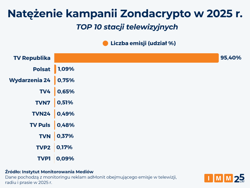 Według danych adMonit IMM w 10 analizowanych stacjach telewizyjnych, w 2025 roku wyemitowano łącznie 5 869 spotów giełdy Zondacrypto. Zdecydowana większość – 5 599 emisji, co odpowiada 95,4% wszystkich zmonitorowanych spotów – ukazało się na kanale TV Republika. Pozostałe dziewięć stacji nadało łącznie 270 emisji, przy czym wszystkie one miały miejsce w styczniu i lutym 2025 roku. Drugie miejsce pod względem liczby emisji spotów giełdy zajął Polsat z wynikiem 64 spotów (1,09% udziału), a trzecie – Wydarzenia 24 z 44 emisjami (0,75%).