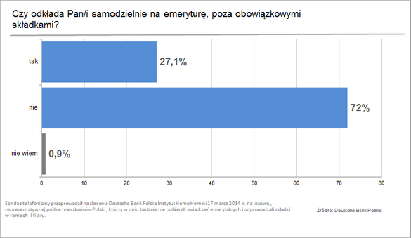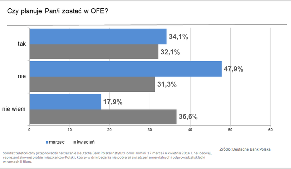 Badania Deutsche Bank Polska zrealizowane 17 marca 2014 i 5 kwietnia 2014 r. przez Instytut Homo Homini, na wybranej losowo, reprezentatywnej grupie Polaków, metodą telefoniczną. Na pytania o plany dotyczące OFE odpowiadali tylko respondenci, którzy nie ukończyli 64 roku życia
